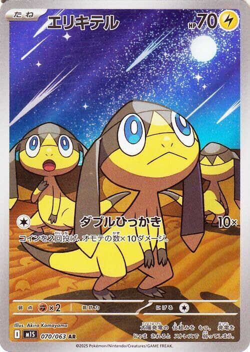 ★収録:ポケモンカードゲーム 拡張パック「メガシンフォニア」 ■カード名:エリキテル/Helioptile ■HP:70/タイプ:雷 ■分類:たねポケモン ■ワザ ●無:ダブルひっかき/ダメージ:100x コインを2回投げ、オモテの数×10ダメージ。 ■弱点:闘×2/抵抗力:0-/にげる1 ■レギュレーション:G (070/063) ※画像は初回版のカードですが、初回版と再販のものは全て同じ在庫として管理しており、お選びすることができませんので予めご了承くださいませ。