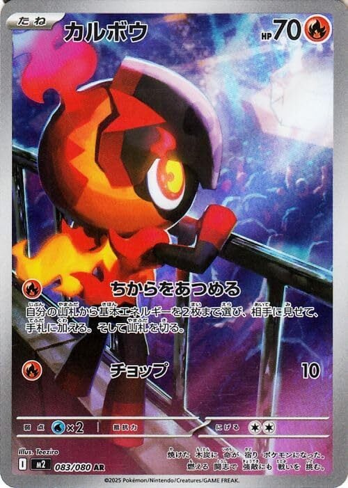 ★収録:ポケモンカードゲーム MEGA拡張パック「インフェルノX」 ■カード名:カルボウ/Charcadet ■HP:70/タイプ:炎 ■分類:たねポケモン(マメバッタ) ■ワザ ●炎:ちからをあつめる/ダメージ: 自分の山札から基本エネルギーを2枚まで選び、相手に見せて、手札に加える。そして山札を切る。 ●炎:チョップ/ダメージ:10 ●:/ダメージ: ■弱点:水×2/抵抗力:-/にげる2 ■レギュレーション:G (083/080) ※画像は初回版のカードですが、初回版と再販のものは全て同じ在庫として管理しており、お選びすることができませんので予めご了承くださいませ。