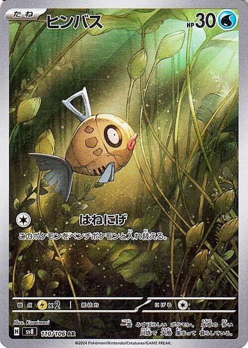 ★収録:ポケモンカードゲーム スカーレット&バイオレット 「超電ブレイカー」 ■カード名:ヒンバス/Feebas ■HP:30/タイプ:水 ■分類:たねポケモン ■ワザ ●無:はねにげ このポケモンをベンチポケモンと入れ替える。 ■弱点:雷×2/抵抗力:-/にげる1 ■レギュレーション:G (110/106) ※画像は初回版のカードですが、初回版と再販のものは全て同じ在庫として管理しており、お選びすることができませんので予めご了承くださいませ。