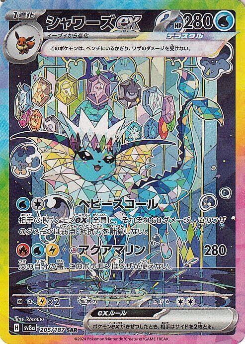 ★収録:ポケモンカードゲーム スカーレット&バイオレット ハイクラスパック「テラスタルフェスex」 ■カード名:シャワーズex/Vaporeonex ■HP:280/タイプ:水 ■分類:1進化(イーブイ) テラスタル このポケモンは、ベンチにいるかぎり、ワザのダメージを受けない。 ■ワザ ●水無:ヘビースコール 相手の「ポケモンex」全員に、それぞれ60ダメージ。このワザのダメージは弱点・抵抗力を計算しない。 ●炎水雷:アクアマリン/ダメージ:280 次の自分の番、このポケモンはワザが使えない。 特別なルール ポケモンexがきぜつしたとき、相手はサイドを2枚とる。 ■弱点:雷×2/抵抗力:-/にげる2 ■レギュレーション:H (205/187) ※画像は初回版のカードですが、初回版と再販のものは全て同じ在庫として管理しており、お選びすることができませんので予めご了承くださいませ。